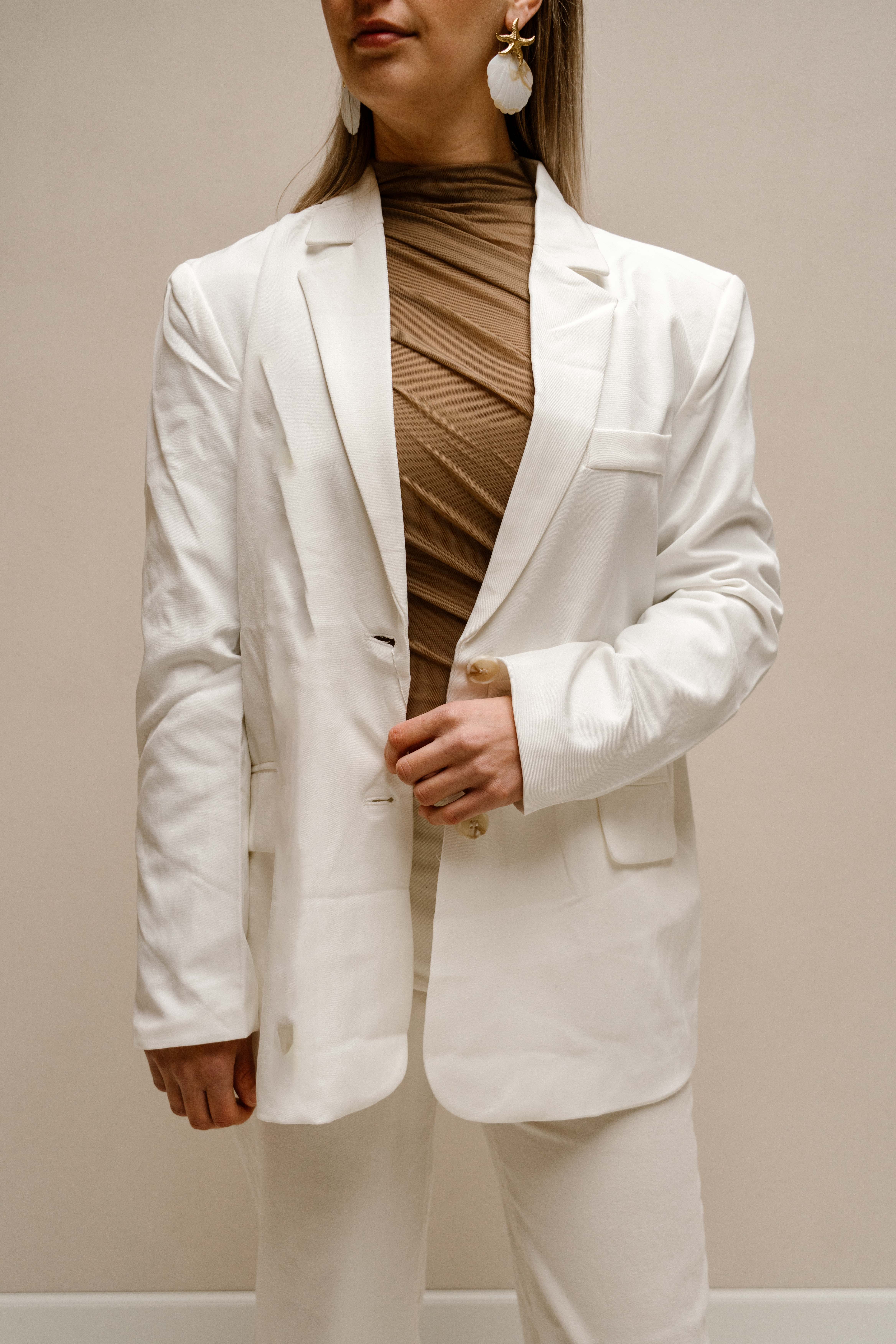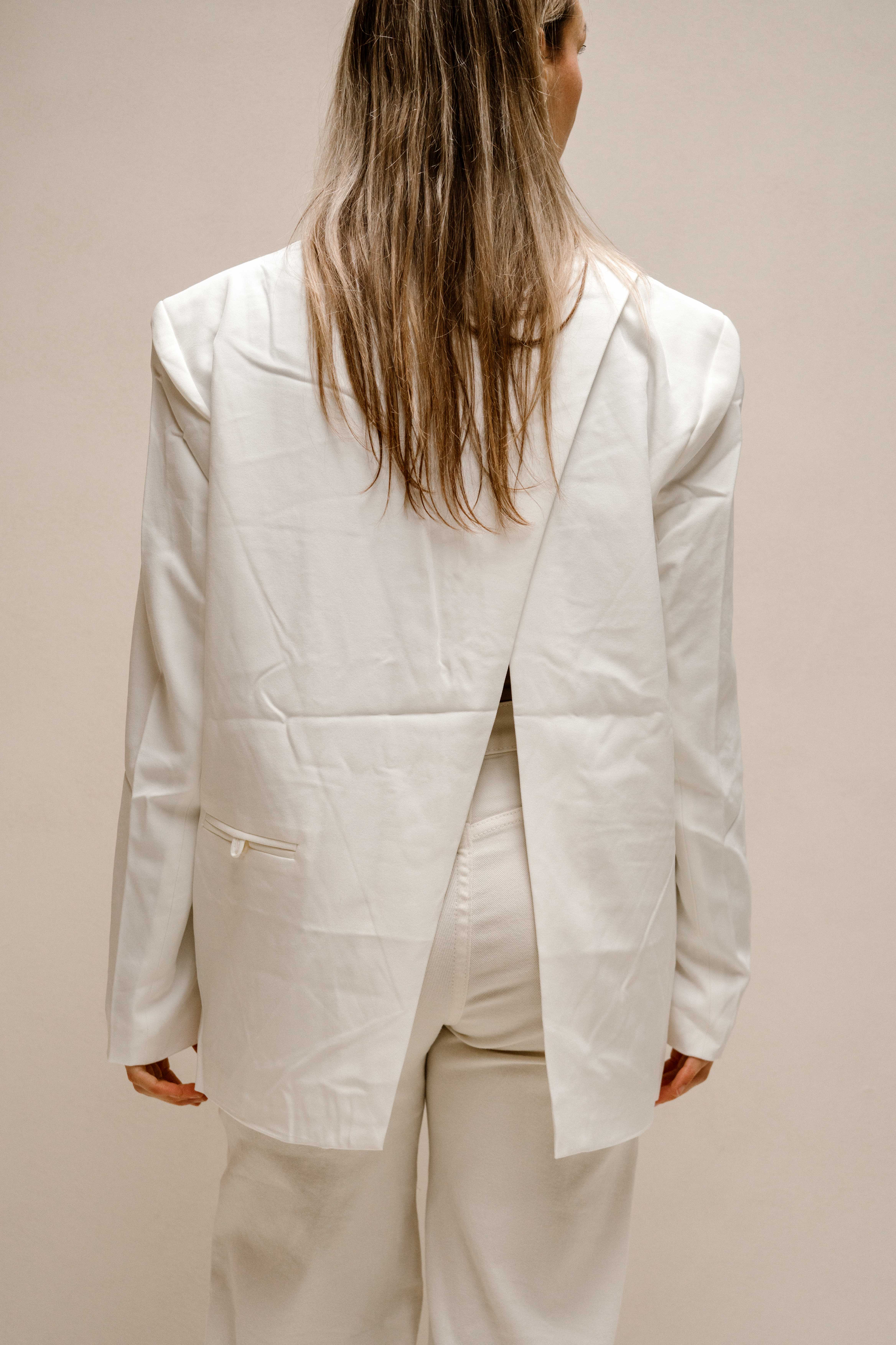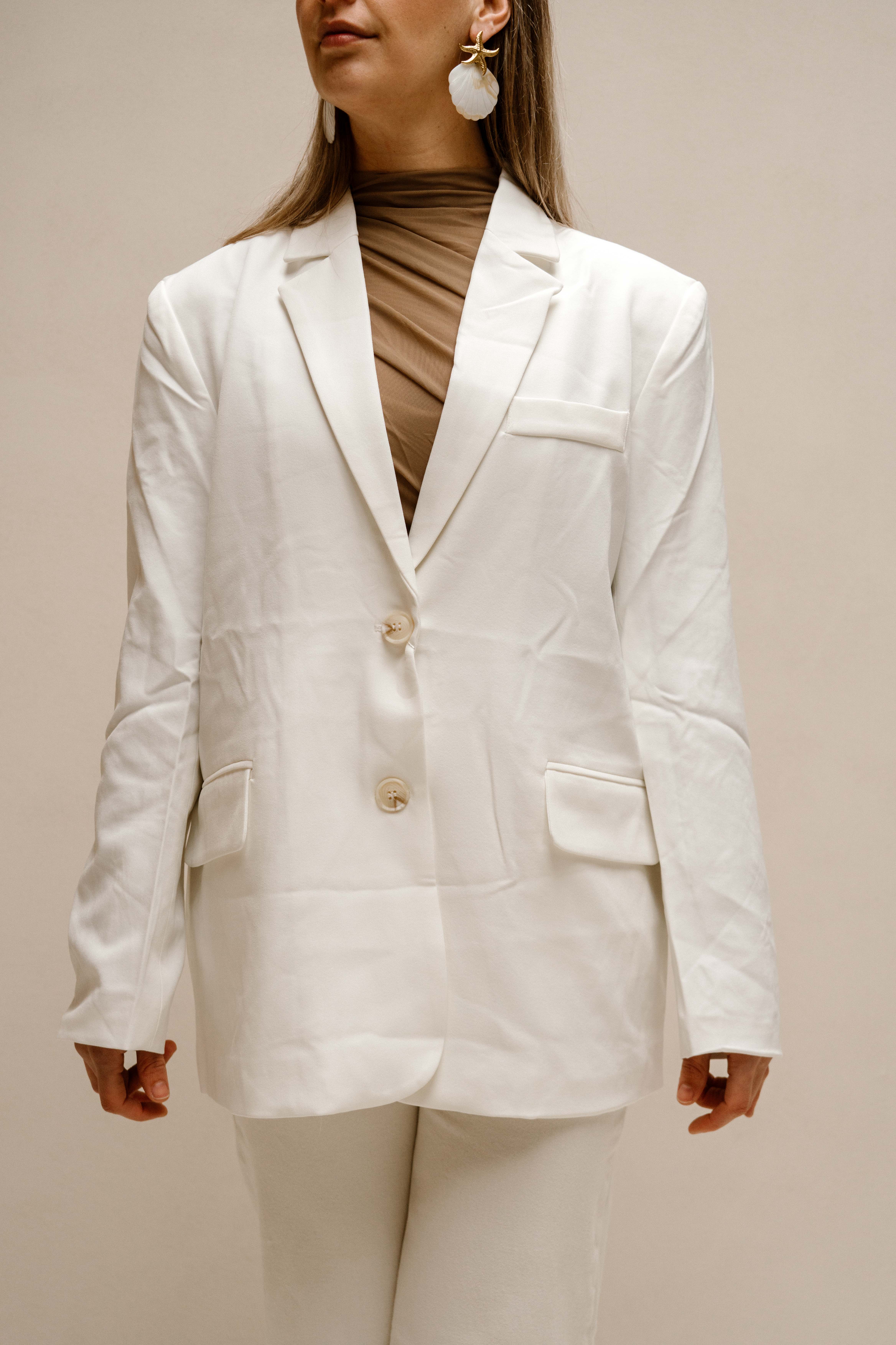 Prachtige oversized blazer met aan de achterkant een overslag en zakje. Beschikbaar in twee kleuren wit en ecru.