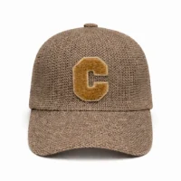 Bruine cap van geweven materiaal met letterdetail, licht en stijlvol.