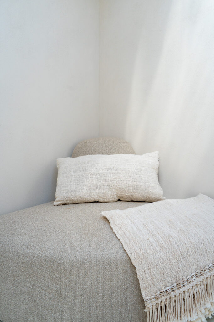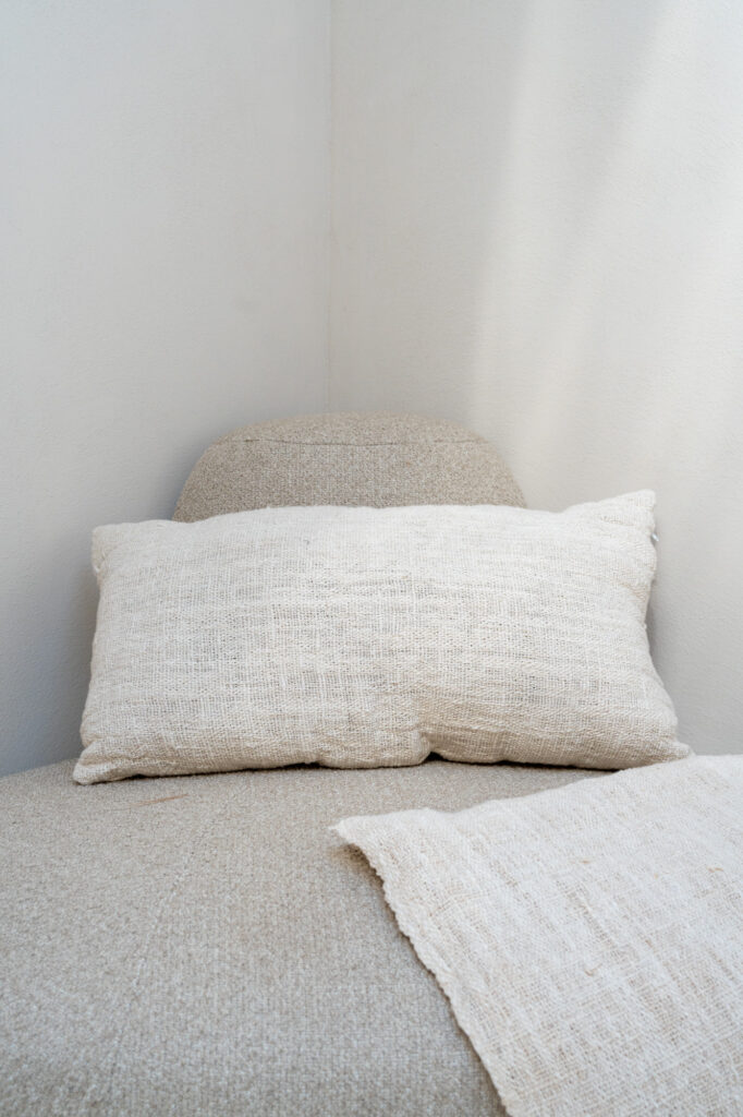 Een langwerpig linnen kussen in een zachte ecru tint. Kussen Yara brengt rust, warmte en een natuurlijke uitstraling in huis.