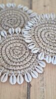 Breng een zomerse, beachy sfeer op tafel met deze onderzetters van sisal, afgewerkt met een rand van kaurischelpen. Perfect voor glazen en koffiekopjes, met een natuurlijke en stijlvolle uitstraling.