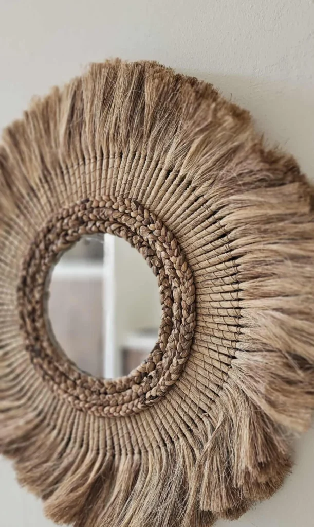 De spiegel vormt een echte blikvanger aan de muur en voegt direct textuur en diepte toe aan je interieur. Dankzij het zachte, natuurlijke kleurpalet past hij moeiteloos binnen een bohemian, landelijke of tropische woonstijl. Boven een dressoir, in de hal of als statement piece in de woonkamer – deze spiegel brengt rust, warmte en een subtiel vleugje exotische charme in elke ruimte.