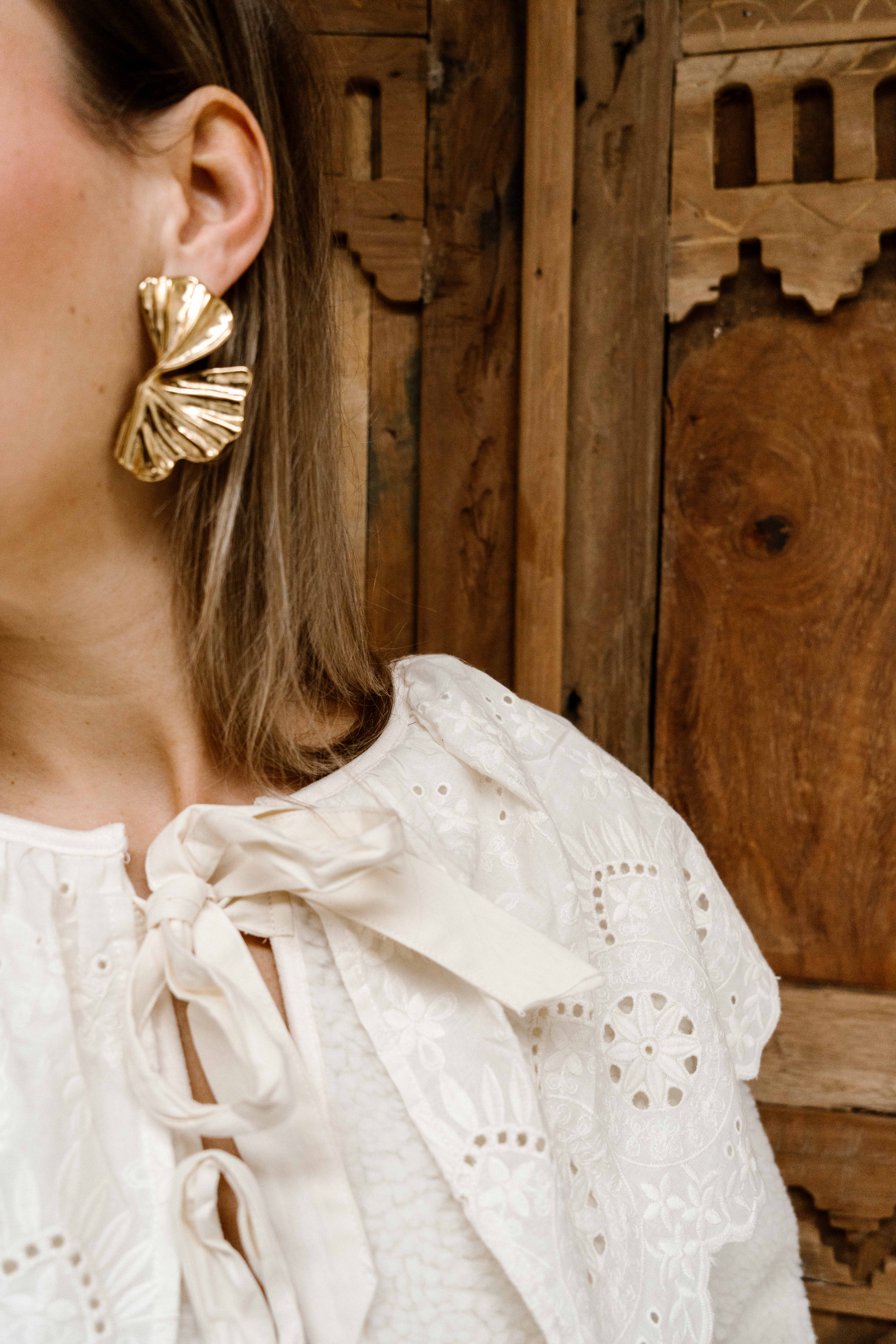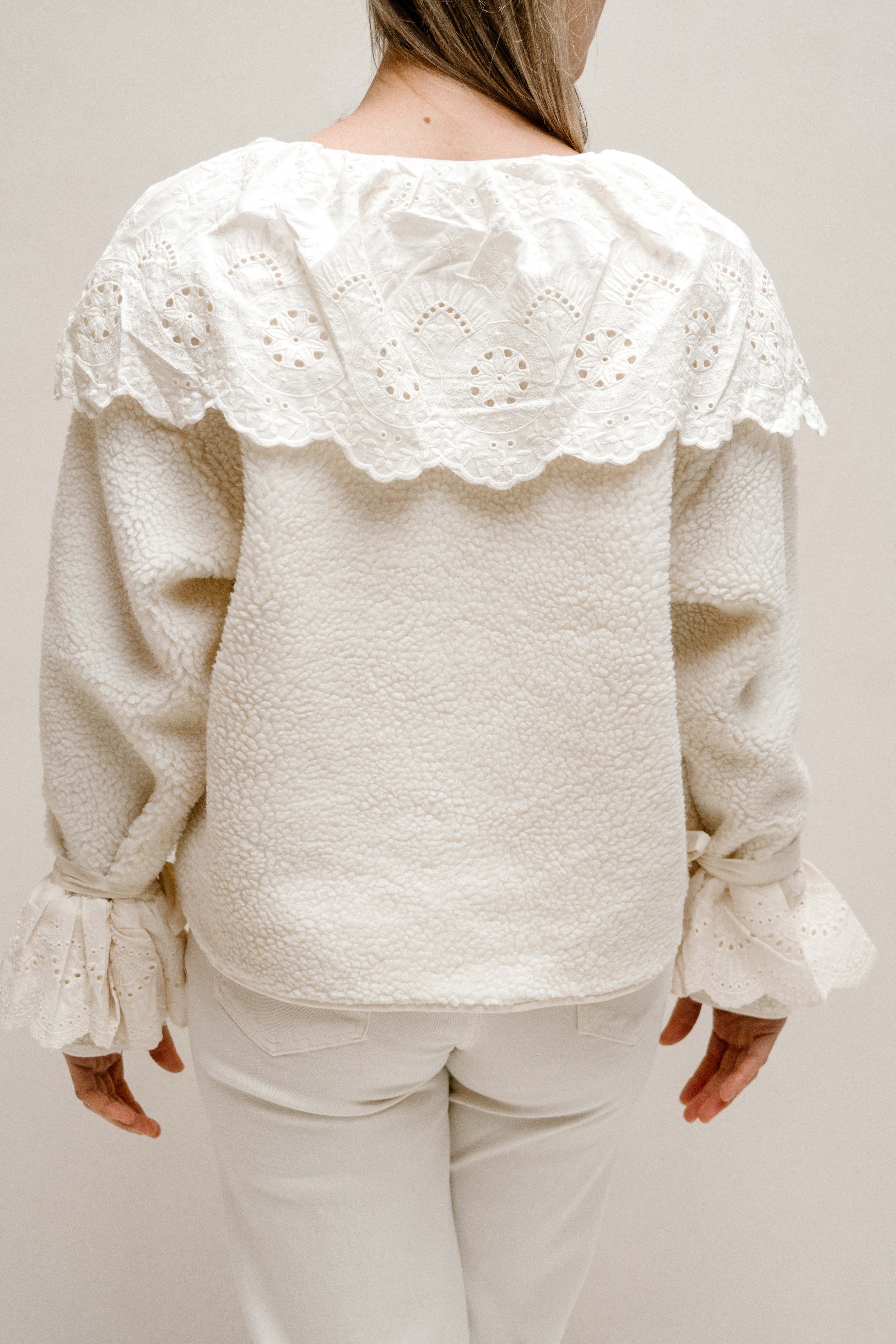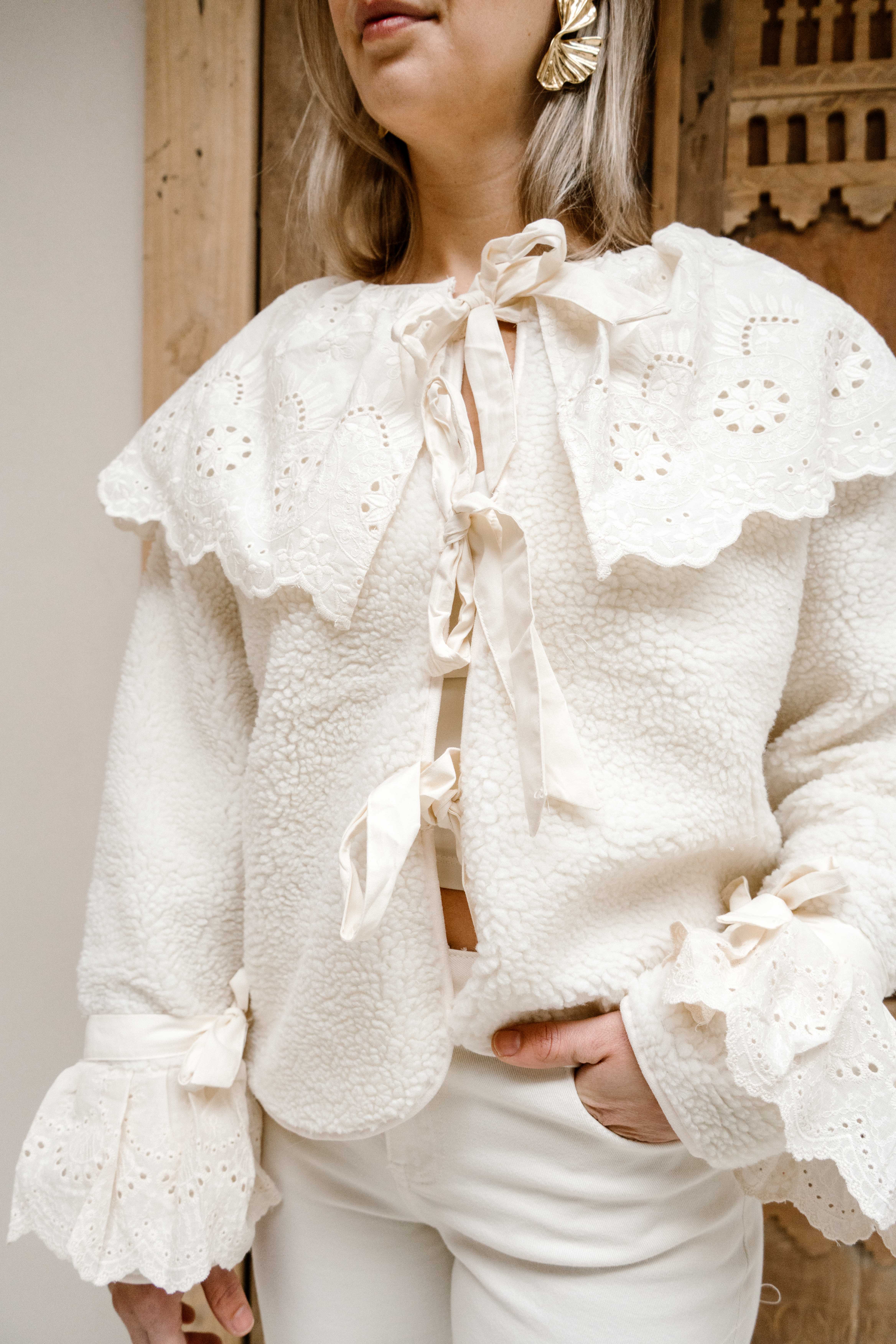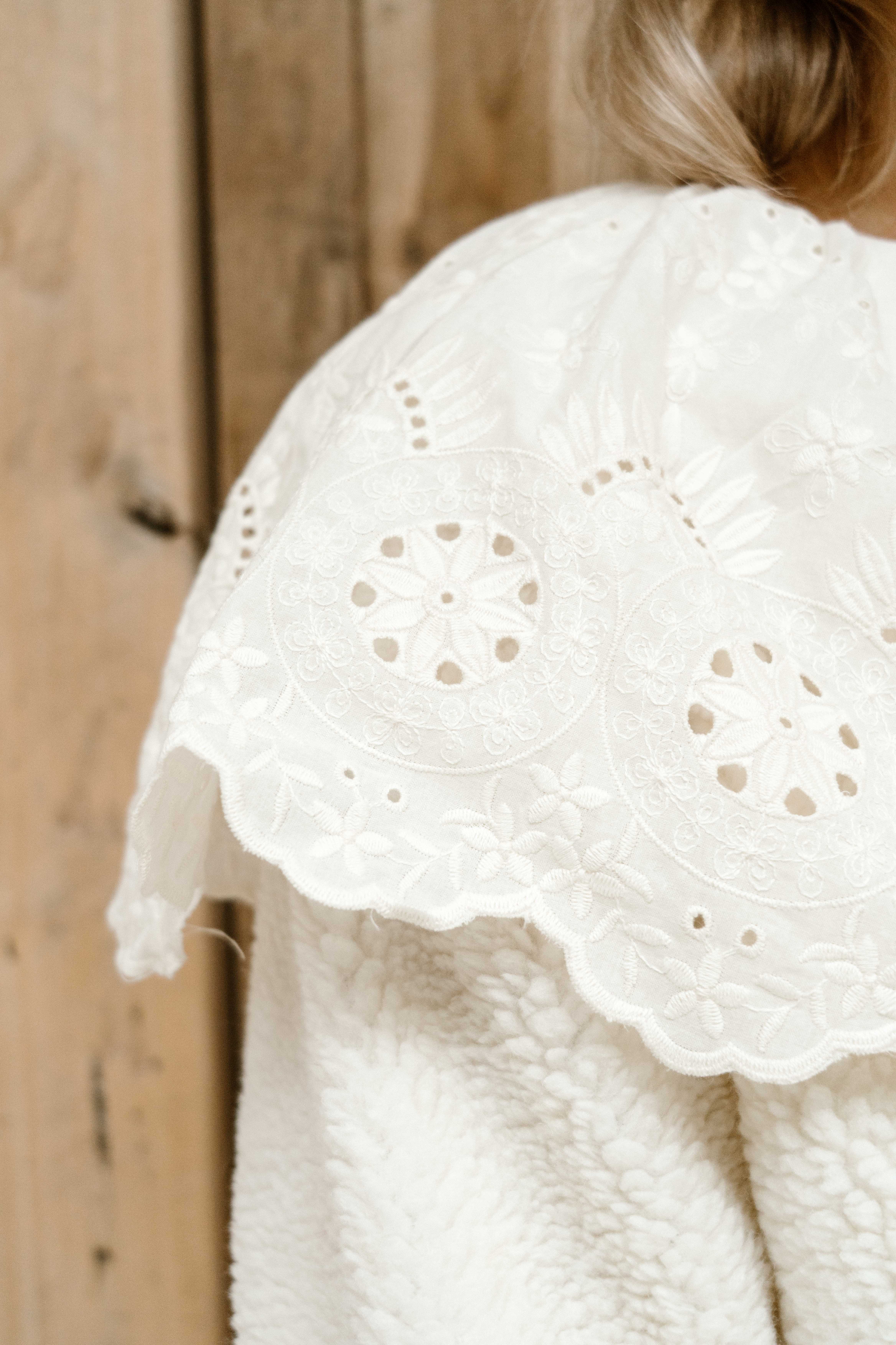 Prachtig broderie vest/jasje met leuke strikjes en grote kraag.